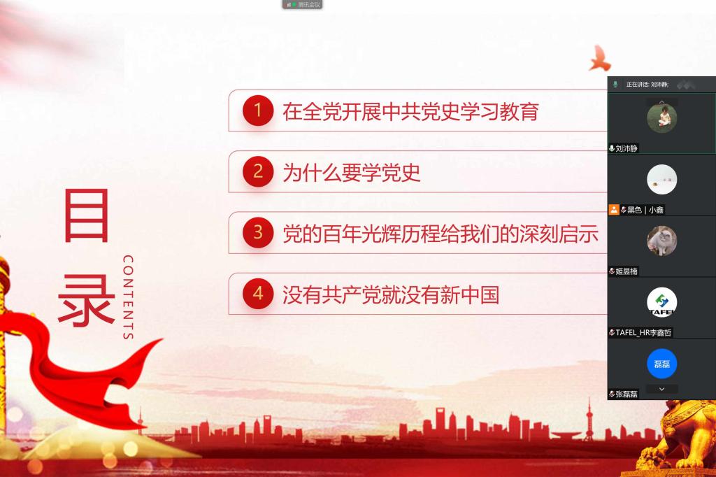 本次党课主要从在全党开展中共党史学习教育、为什么学党史、党的百年辉煌历程给我们的深刻启示、没有共产党就没有新中国等四个方面展开。同时刘沛静从自身对党史的理解和认识,用八个字“救国、兴国、复国、强国”概括了党百年艰辛历程。简单又富有内涵的八个字贯穿了整个授课过程,让参加此次党课学习的同志铭记于心。